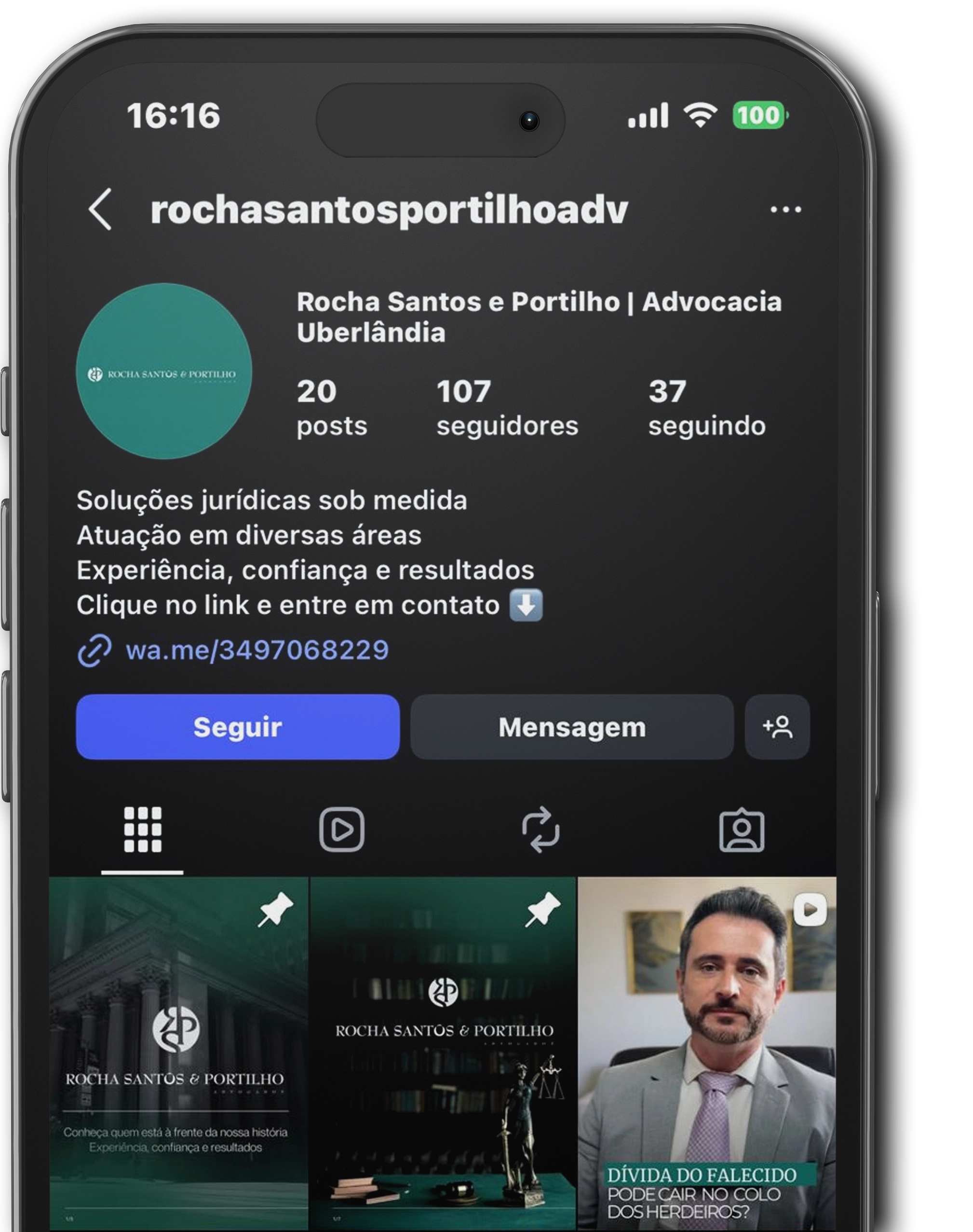 O Escritório Rocha Santos e Portilho, criado no ano de 2007 na cidade Mineira de Uberlândia pelos advogados Fernando Portilho Nascimento, Leonardo Resende Rocha e Guilherme Carneiro Dos Santos opera, hoje, com mais de 50 colaboradores diretos, entre advogados, bacharéis em Direito, funcionários e estagiários, além de mais de 1500 correspondentes em várias comarcas do país. Suas atividades são voltadas, principalmente, aos direitos societário e empresarial e à advocacia de apoio, possuindo uma banca especializada na prestação de serviços a outros escritórios de advocacia e grandes empresas, buscando oferecer alternativas de atendimento em todas as comarcas de Minas Gerais, São Paulo e Rio Grande do Sul, diminuindo distâncias de forma a possibilitar que seus parceiros promovam um atendimento de excelência a seus clientes, tudo isso de forma ágil e menos dispendiosa.